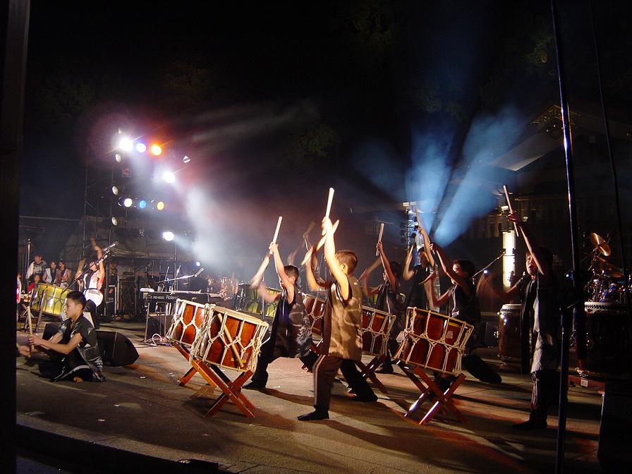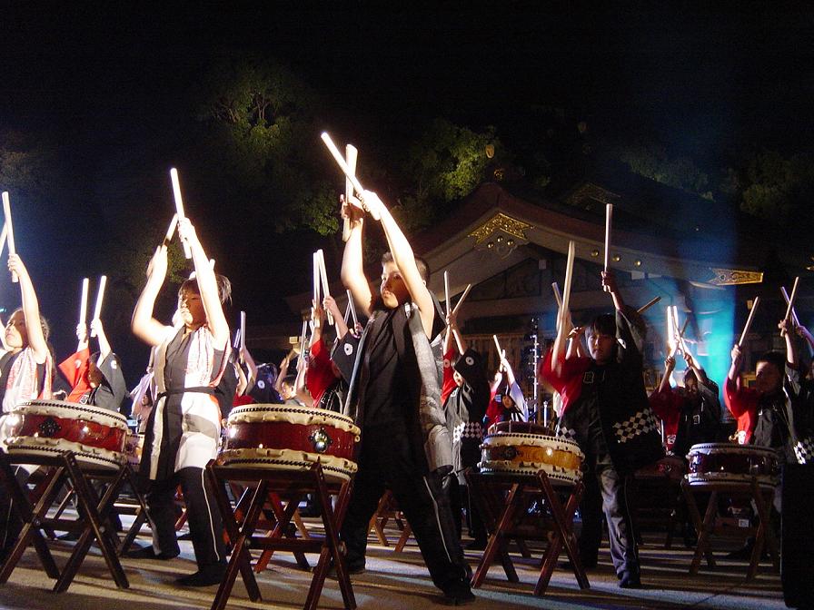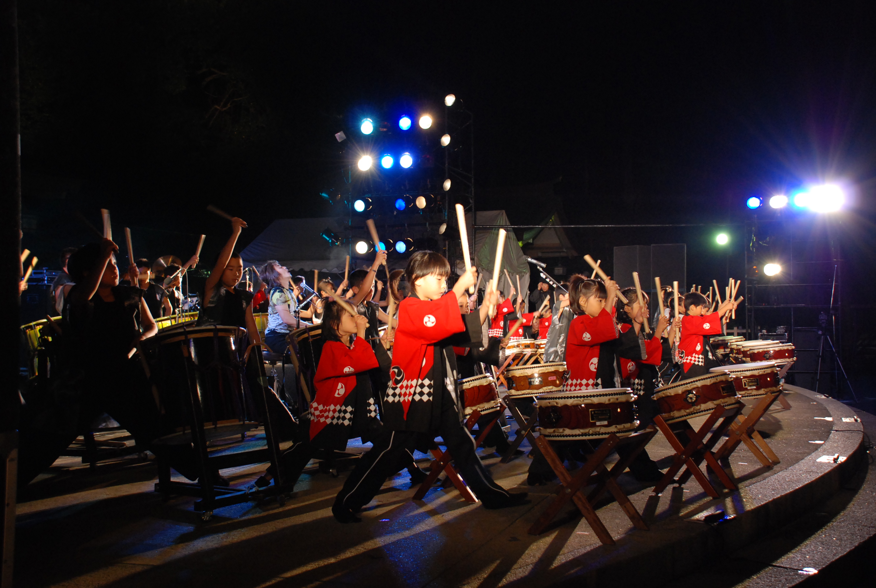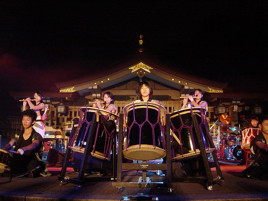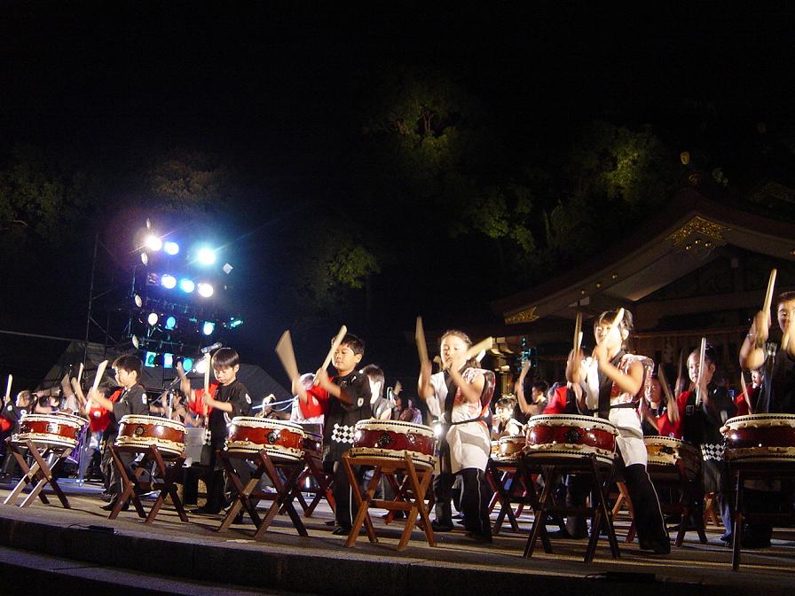 琴が静かに演奏されたあと、装束に身を包んだ原田真二の打ち鳴らす太鼓が響き渡る。それに呼応して子供たちの太鼓がいっせいに打ち鳴らされた。